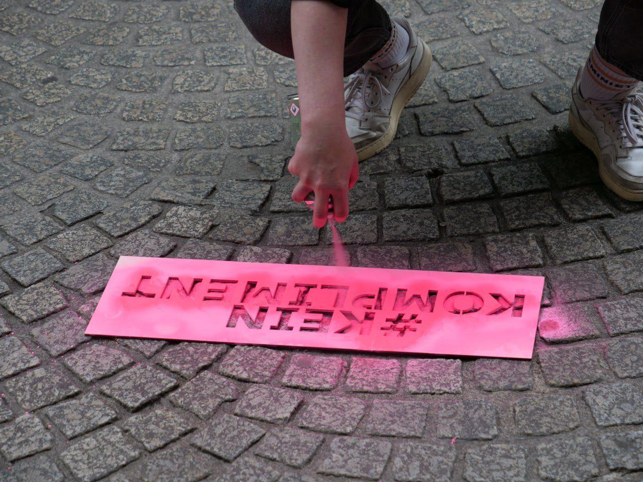 Auch unser wöchentliches Frauenfrühstück stand im Zeichen von #keinkompliment und bot Raum für Austausch und Vernetzung. Im Anschluss daran besuchte die Künstlerin Carina Hommel gemeinsam mit den Teilnehmerinnen und weiteren interessierten Menschen aus Oberhausen die Ausstellung auf dem Museumsbahnsteig. Beim Betrachten und Reflektieren der Bilder entstand ein intensiver Austausch über eigene Erfahrungen und Möglichkeiten des Selbstschutzes. Der Ausstellungsbesuch endete mit einer gemeinsamen Sprayaktion.