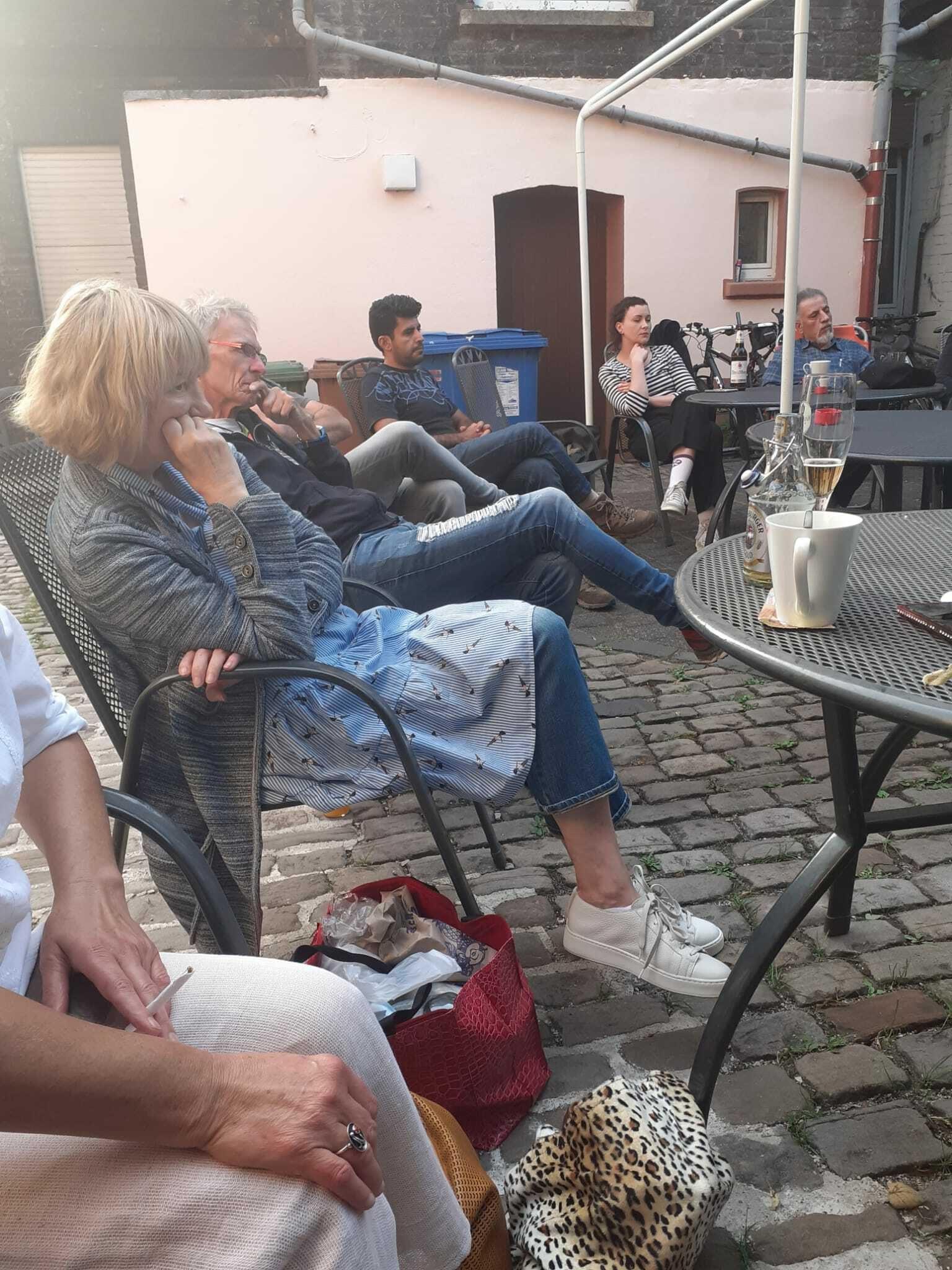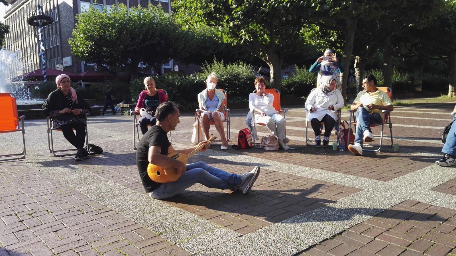 Und tags drauf: FR 20.08.: Integrationskurs, Teil 1: Integration und Kommunikation. Mit einem beeindruckenden Vortrag von Abdo Issa, anschließend weiteren Wortbeiträgen, Diskussion, Gespräch, Musik & Essen. Auf dem wunderschön sonnigen Friedensplatz, am Brunnen :)