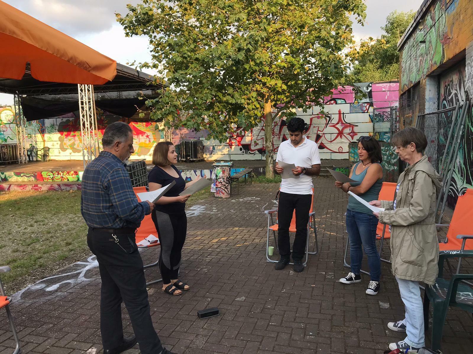 Zum Beginn der neuen Woche: endlich auch mal Quartiersgarten ohne Regen! Auf dem Museumsbahnsteig wurden die ersten Sounds of Oberhausen gesammelt, im Hof des Druckluft übte The Choir zum ersten Mal türkische Lieder ein – und im Garten K14 hatte unser Seminar Der gewöhnliche Lesende den Autor Andreas von Westphalen zu Gast, der mit dem Seminar sein Werk "Die Wiederentdeckung des Menschen" diskutierte.