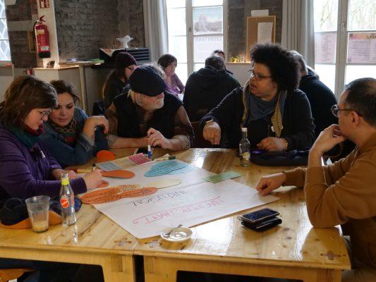 „Stadt – Raum – Natur“, „Politik – Geschichte – Diskussion“, „Gemeinsam – Aktiv – Kreativ“, „Nachbarschaft – Vielfalt – Inklusion“, „Kinder – Jugend – Alter“ waren die Themenfelder, zu denen sich die rund 30 Interessierten austauschten. Welche Probleme gilt es anzugehen, welche Ideen und Wünsche um dies zu tun? Und wie können diese Wünsche und Ideen konkret in unserem Quartier umgesetzt werden? Knapp 3 Stunden lang wurde heiß diskutiert und gebrainstormt, bis die Köpfe rauchten. Am Ende gab es mehr Ergebnisse als wir sortieren konnten und eine leckere vegane Gulaschsuppe.