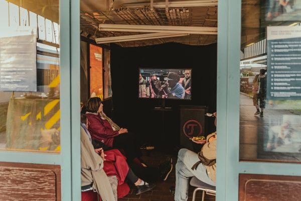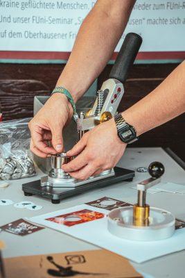 Zugleich war der gesamte Museumsbahnsteig mit Menschen und Aktionen belebt: mit einem bunt bemalten Sound-Container von Klangschichten Ruhr, mit dem komplett ausgefahrenen selbstgebauten Minigolf-Parcours unserer Partner*innen vom Supermarkt der Ideen, mit Sophias Linolschnitt- und Druck- und Button-Press-Werkstatt für alle großen und kleinen Kreativlinge, einem köstlichen Mahl unserer Refugees‘ Kitchen auf schwebendem Tisch, unserer eigenen Bild-/Text- und Video-Ausstellung zu 4 Jahren Utopolis am und im LVR-Museums-Häuschen und Danilos FUni-Bar als kommunikatives Zentrum des Ganzen.